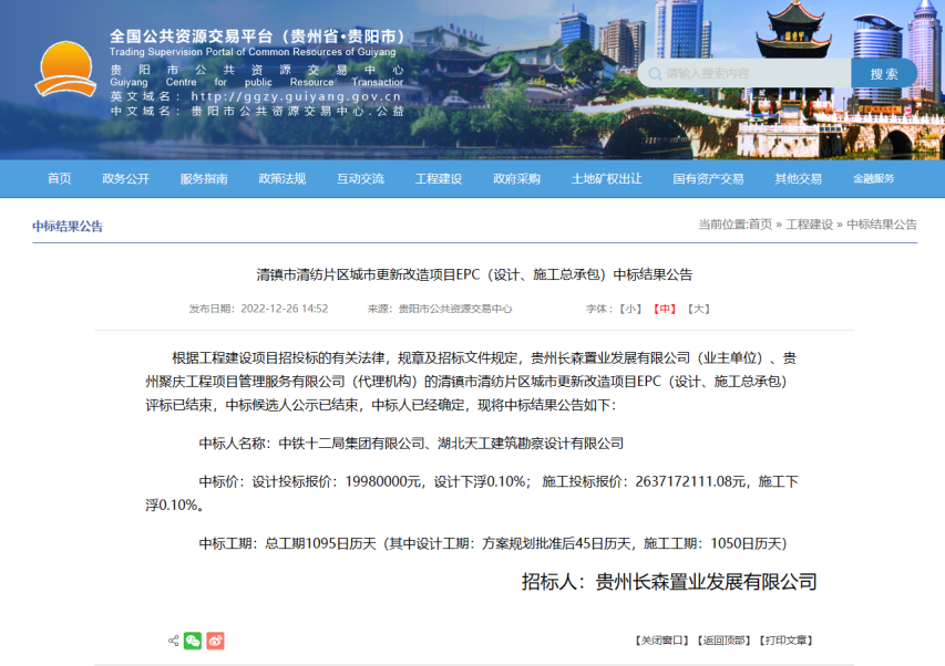 2022年12月26日,貴陽市公共資源交易中心網站發布清鎮市清紡片區城市更新改造項目EPC(設計、施工總承包)中標結果公告,湖北天工建筑勘察設計有限公司聯合中鐵十二局集團有限公司中標26億城市更新改造EPC項目,其中設計費1998萬,中標總工期1095天,設計工期為方案規劃批準后45天,施工工期1050天。