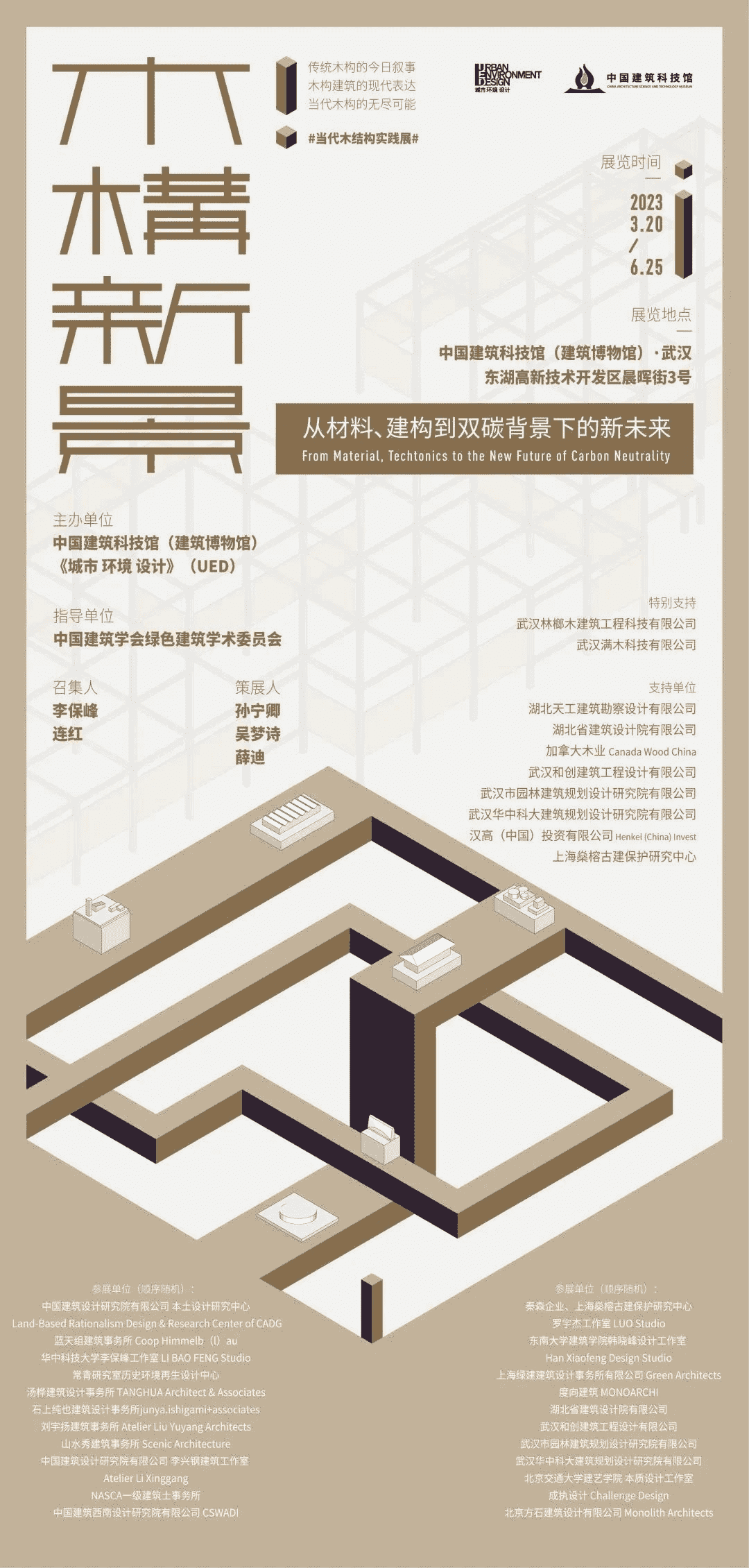 由湖北天工建筑勘察設計有限公司牽頭支持李保峰大師召集,《城市 環境 設計》雜志和中國建筑科技館主辦的“木構新景:當代木結構實踐展”將于3月20日至6月25日在武漢中國建筑科技館舉辦,主題是:從材料、建構到雙碳背景下的新未來!