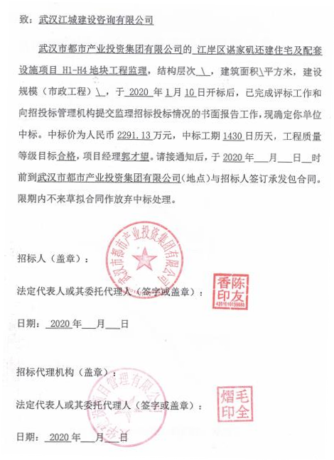 江岸區諶家磯還建住宅及配套設施項目 H1-H4 地塊工程監理 項目中標通知書: